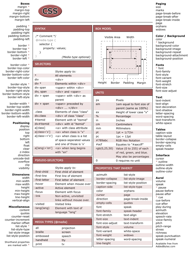 В спецификации CSS упоминается куча свойств, о многих из которых очень легко забыть или перепутать. Многие свойства имеют сокращенную запись, позволяя задавать комплекс параметров одной строкой. Внешние колонки шпаргалки посвящены свойствам.